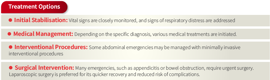 An abdominal emergency is a condition within the abdomen that causes sudden pain. Severe pain can quickly become life-threatening. Without immediate diagnosis and treatment, it may lead to critical conditions such as bowel obstruction, perforation, sepsis, organ failure, or death. Abdominal emergencies can result from a wide range of conditions and may also occur due to trauma.