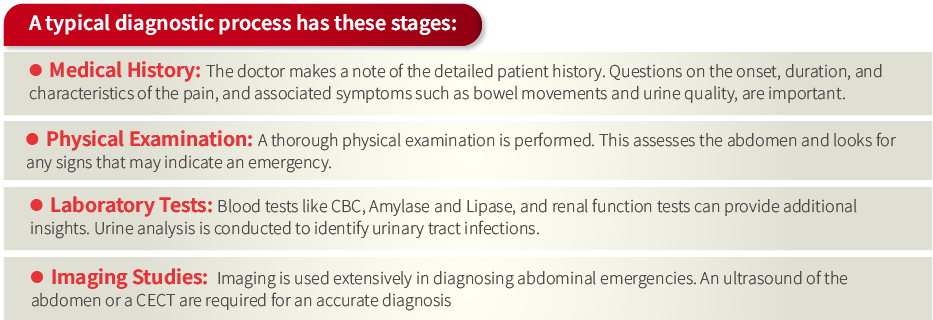 Diagnosis of an abdominal emergency requires a systematic and thorough approach by medical professionals. It is crucial to quickly initiate the appropriate treatment after identifying the underlying causes.