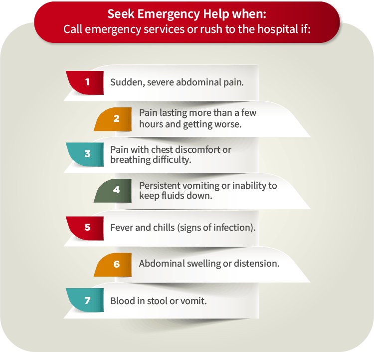 If you notice intense abdominal pain that comes on suddenly, does not subside, involves continuous vomiting, infections in your abdomen, bleeding bowel movements, or symptoms like fever and chills, do not ignore these signs. Take these seriously and get medical help right away so that the problem can be diagnosed and treated without delay.