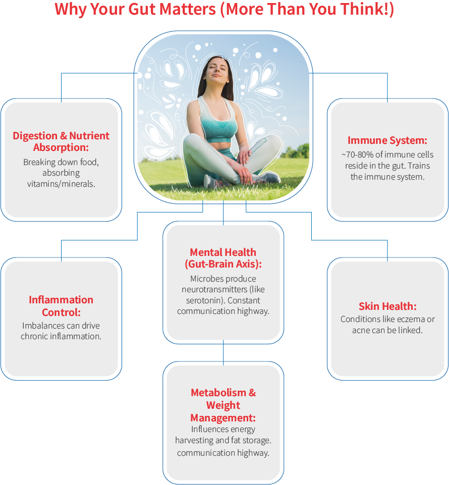 The impact of your gut health extends far beyond your digestive system. It's a central hub influencing almost every aspect of your well-being. From training your immune system to communicating directly with your brain, producing essential vitamins, managing inflammation, and even affecting your skin– a healthy gut is fundamental to a healthy body and mind.