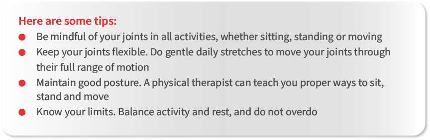 Maintain a healthy weight to reduce stress on weight-bearing joints like hips and knees. Extra weight can worsen arthritis symptoms and increase pain. Gradual, lasting healthy changes are the most effective approach to weight management. Any weight you lose takes stress off your joints, helps with pain and helps decrease the wear out of your joints over time. Talk to your healthcare professional about what you can do to get to and stay at a healthy weight.