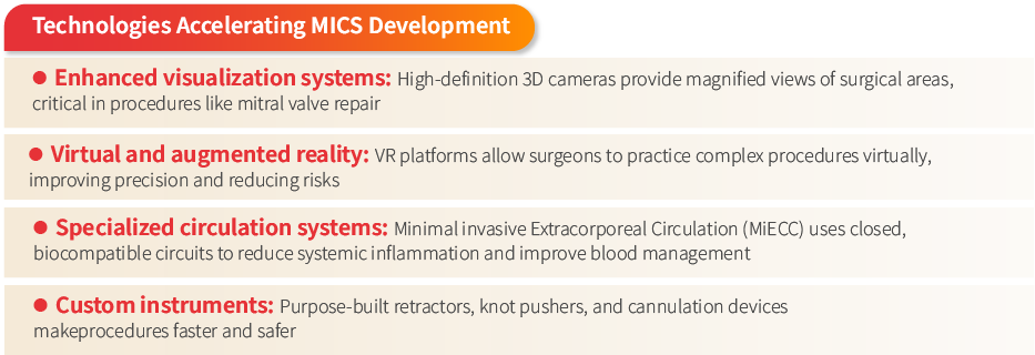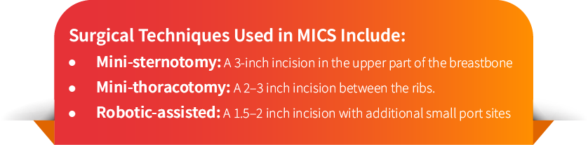 Minimally Invasive Cardiac Surgery (MICS) changes traditional surgery by eliminating the need for full sternotomy. Surgeons now perform procedures through 2–3 inch incisions instead of making 8–10 inch cuts through the breastbone. Small, “keyhole” incisions serve as ports for special instruments, such as catheters, which are guided through arteries or veins, using real-time imaging like X-ray, echocardiography, or CT. Smaller instruments and precision robotics cause less trauma to surrounding tissue, improving outcomes and recovery.